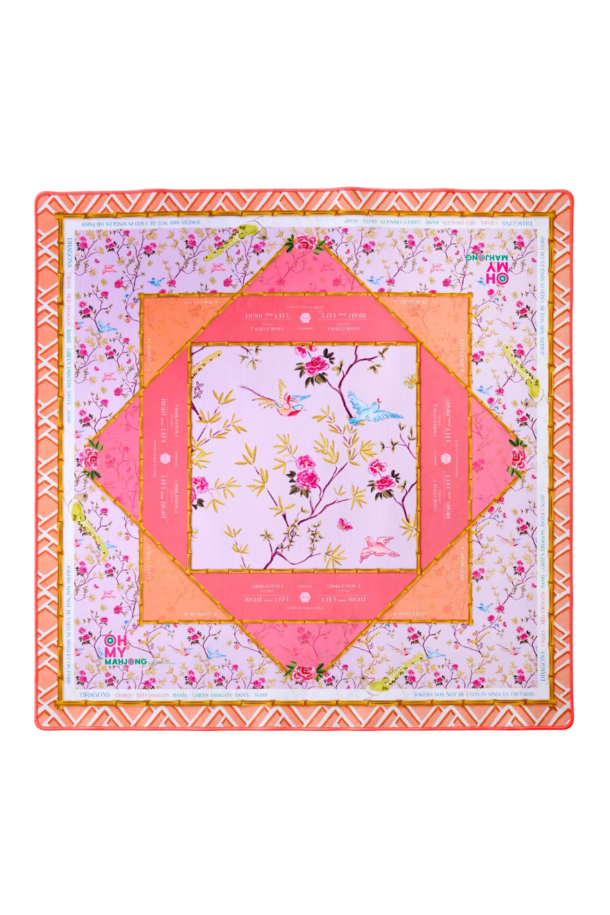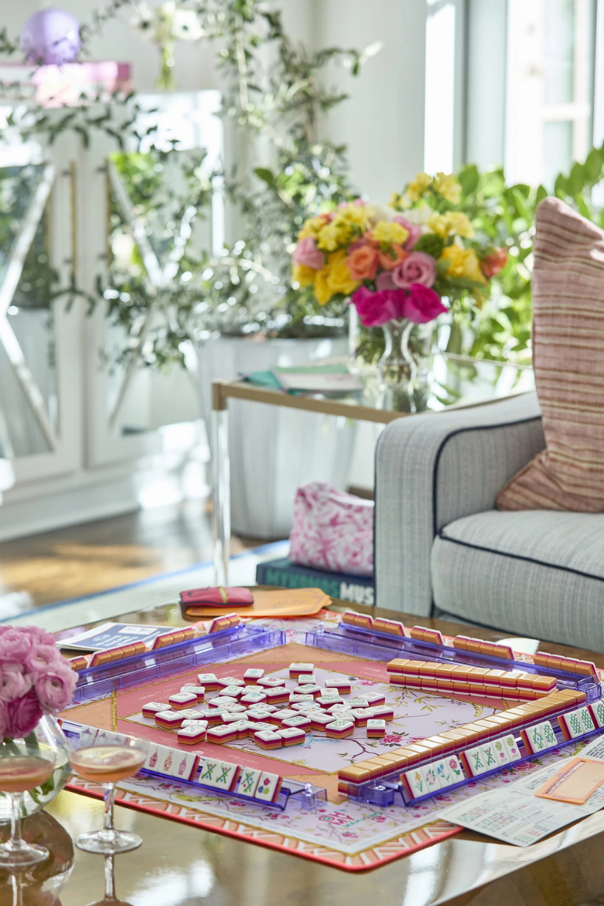 Meet the Goldie Mahjong Mat, created with Catherine Cartie. This mat captures the warm, golden hues of a perfect sunset, paired with radiant pink and coral tones to evoke the beauty of evening light. A bold neon orange border adds an extra pop of playful energy. Goldie’s neoprene construction makes it easy to clean, and its rubber non-slip backing keeps it firmly in place. Instructional reminders along the edges make gameplay elegant and effortless, while its bold design adds a touch of warmth to any game night.