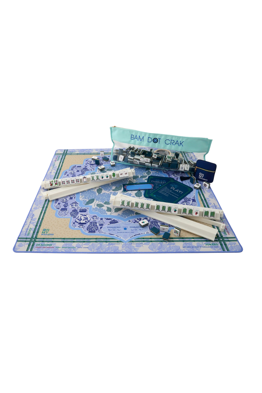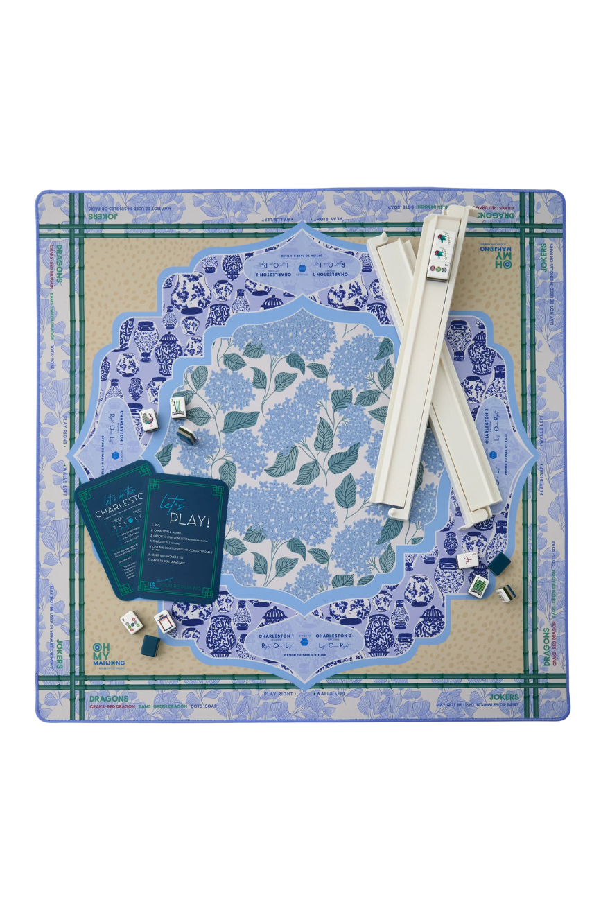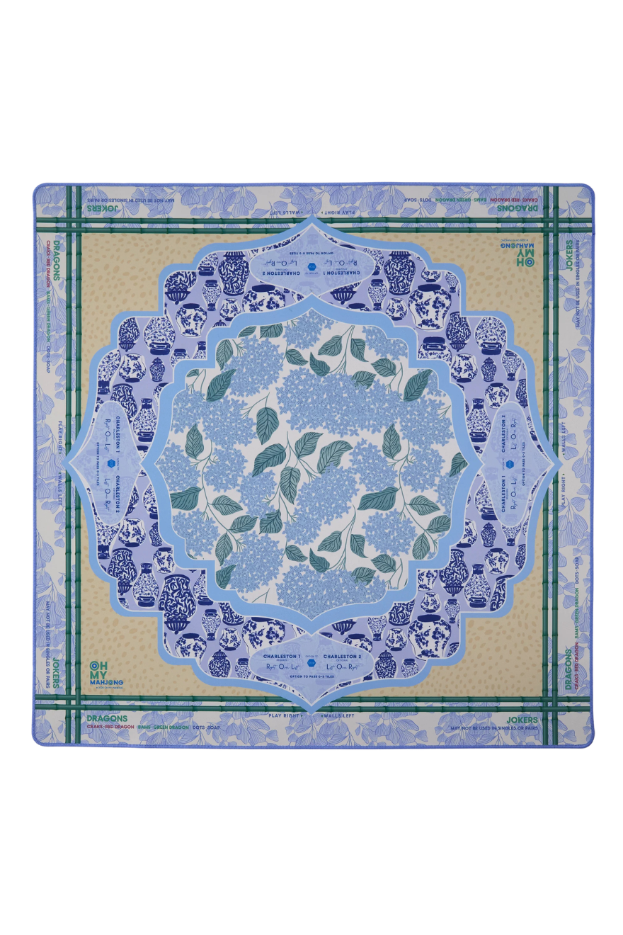 Introducing the Luna Mat, a serene yet statement-making addition to your Mahjong setup, designed for those who love timeless elegance with an artful twist. Awash in calming shades of blue and green, this mat beautifully blends hydrangea blooms, classic ginger jars, and a subtle antelope print for a look that’s equal parts coastal chic and heritage-inspired. It’s sophisticated, layered, and quietly luxurious, the kind of pattern that feels right at home in your garden room, beach house, or candlelit game night setting. Mat